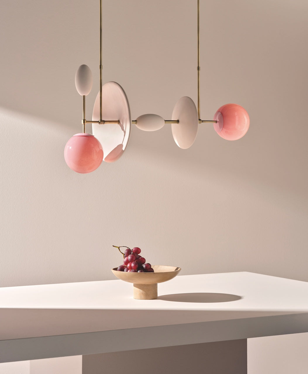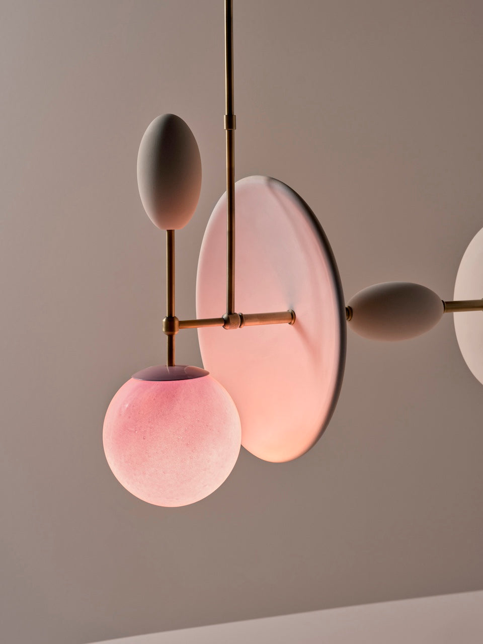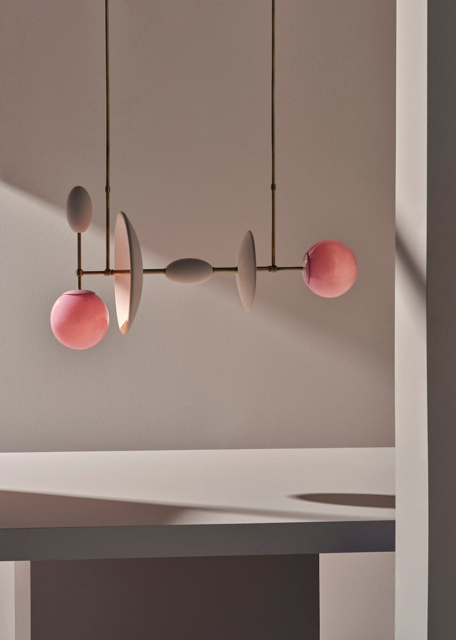 The pendant light Aglaea consists of two pink-pigmented glass spheres that enclose the light body, as well as natural ceramic parts and gold-silver coloured iron tubes, which support and connect the shapes and glass bodies. Two suspension tubes made of sturdy iron keep the lamp stable and secure, with the length of the suspension being adjustable.