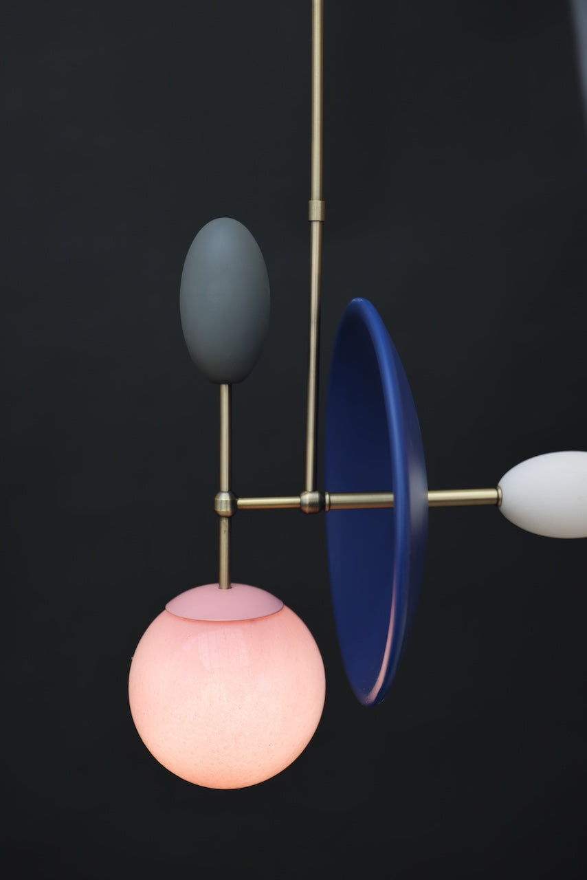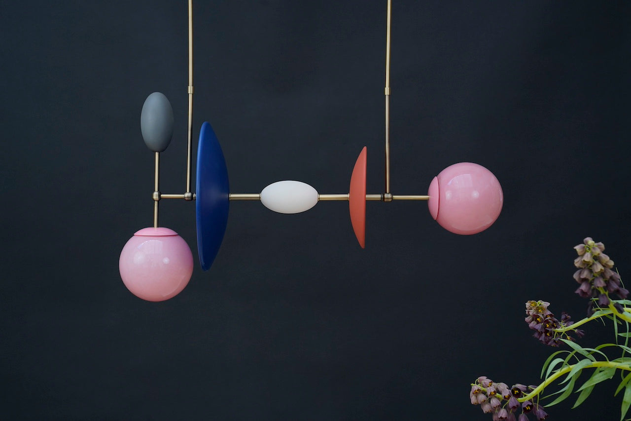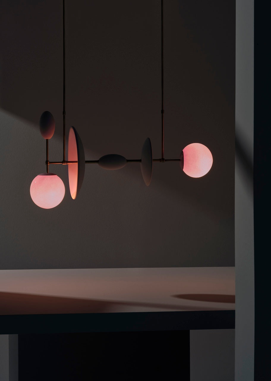 The pendant light Aglaea consists of two pink-pigmented glass spheres that enclose the light body, as well as natural ceramic parts and gold-silver coloured iron tubes, which support and connect the shapes and glass bodies. Two suspension tubes made of sturdy iron keep the lamp stable and secure, with the length of the suspension being adjustable.