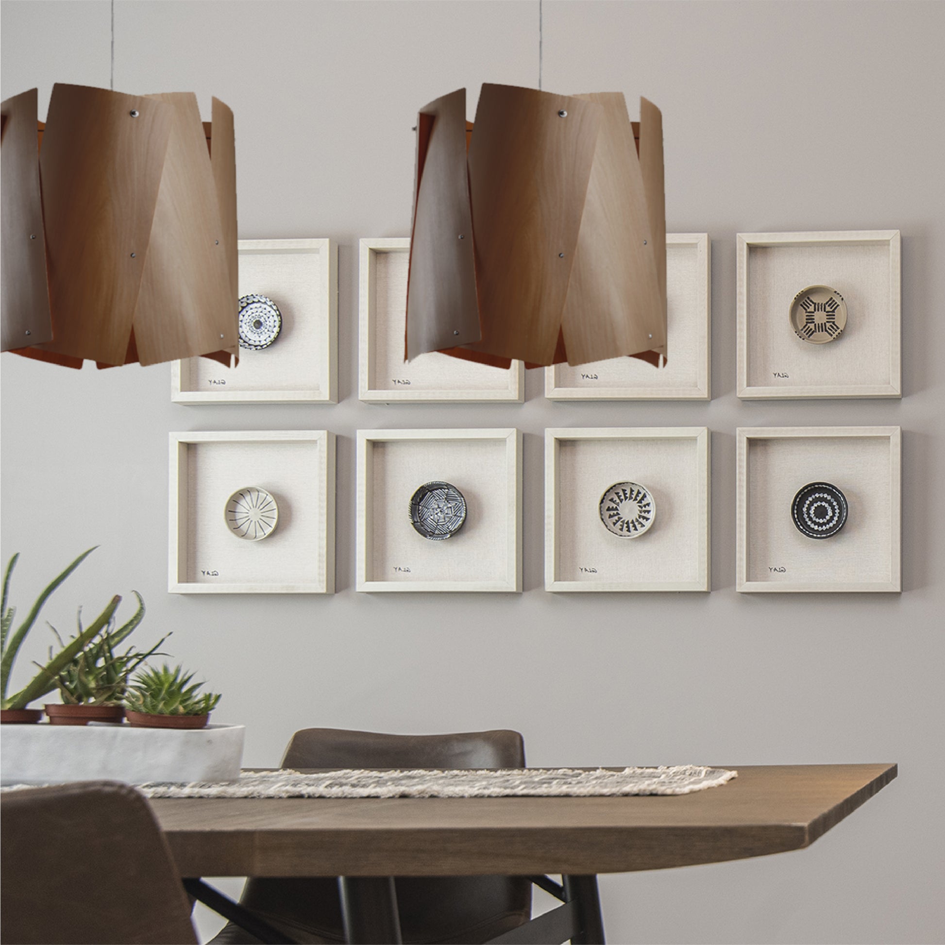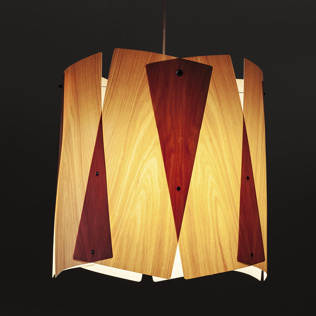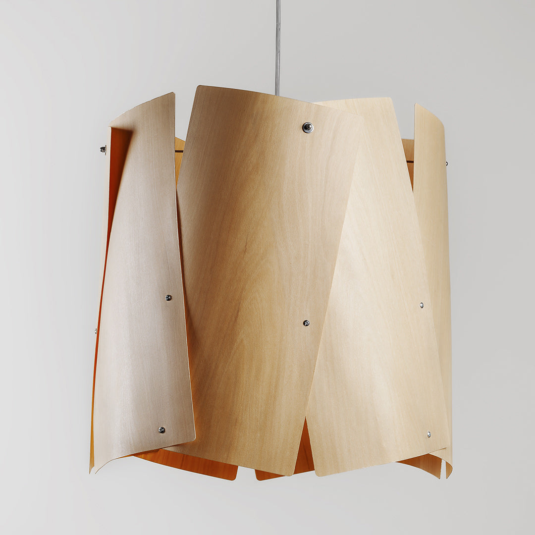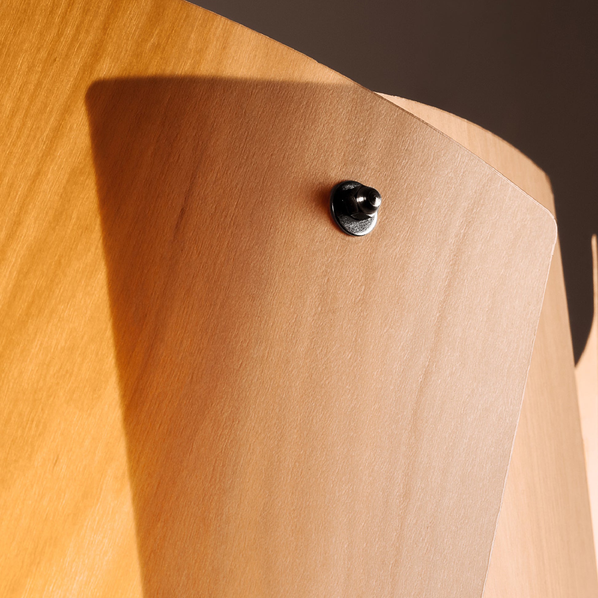 Baum features a unique geometric design created by criss-crossed veneers, reminiscent of the natural pattern found on a tree trunk. Its appearance is enhanced by the use of light, creating varying levels of appreciation.
