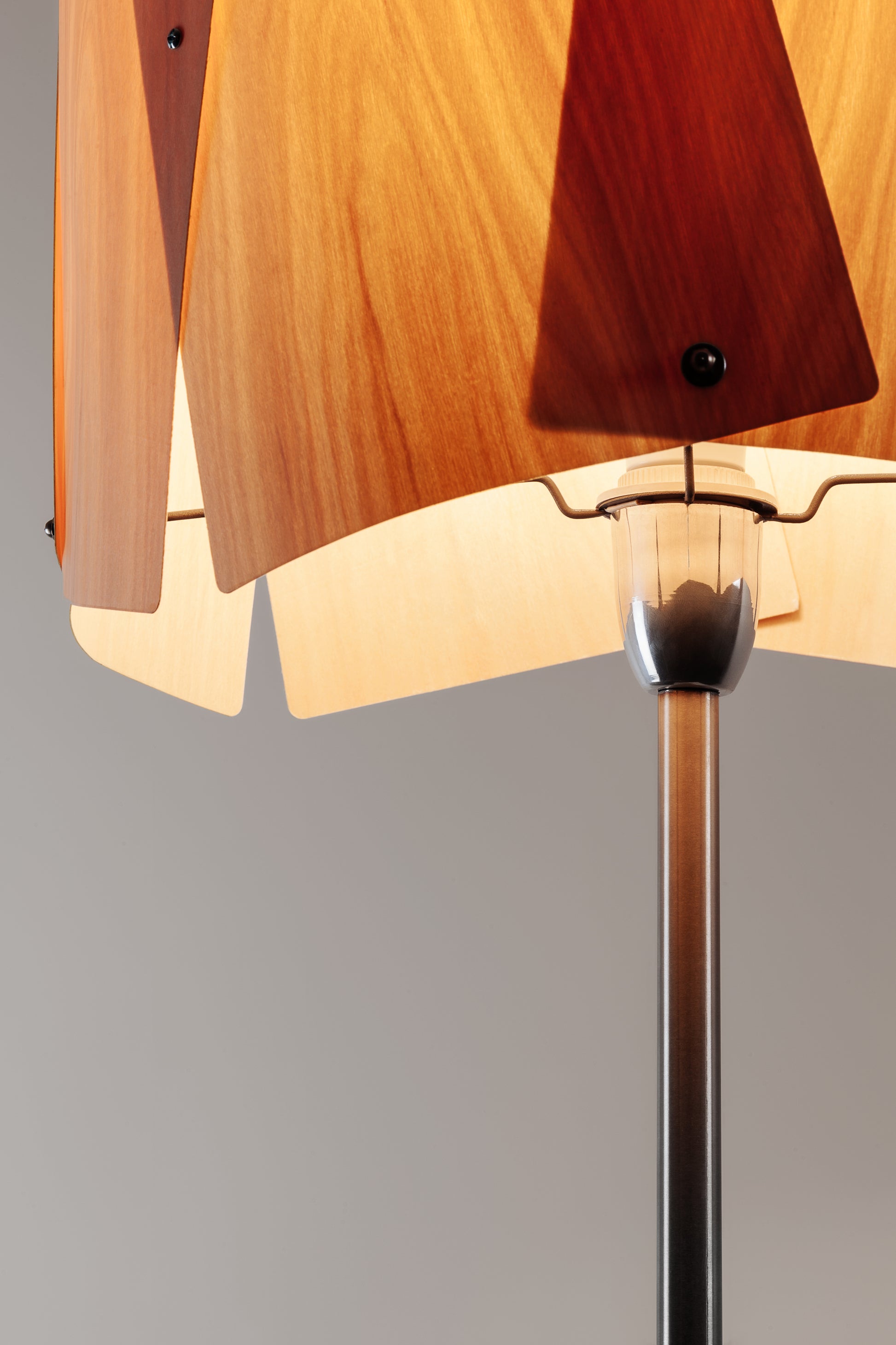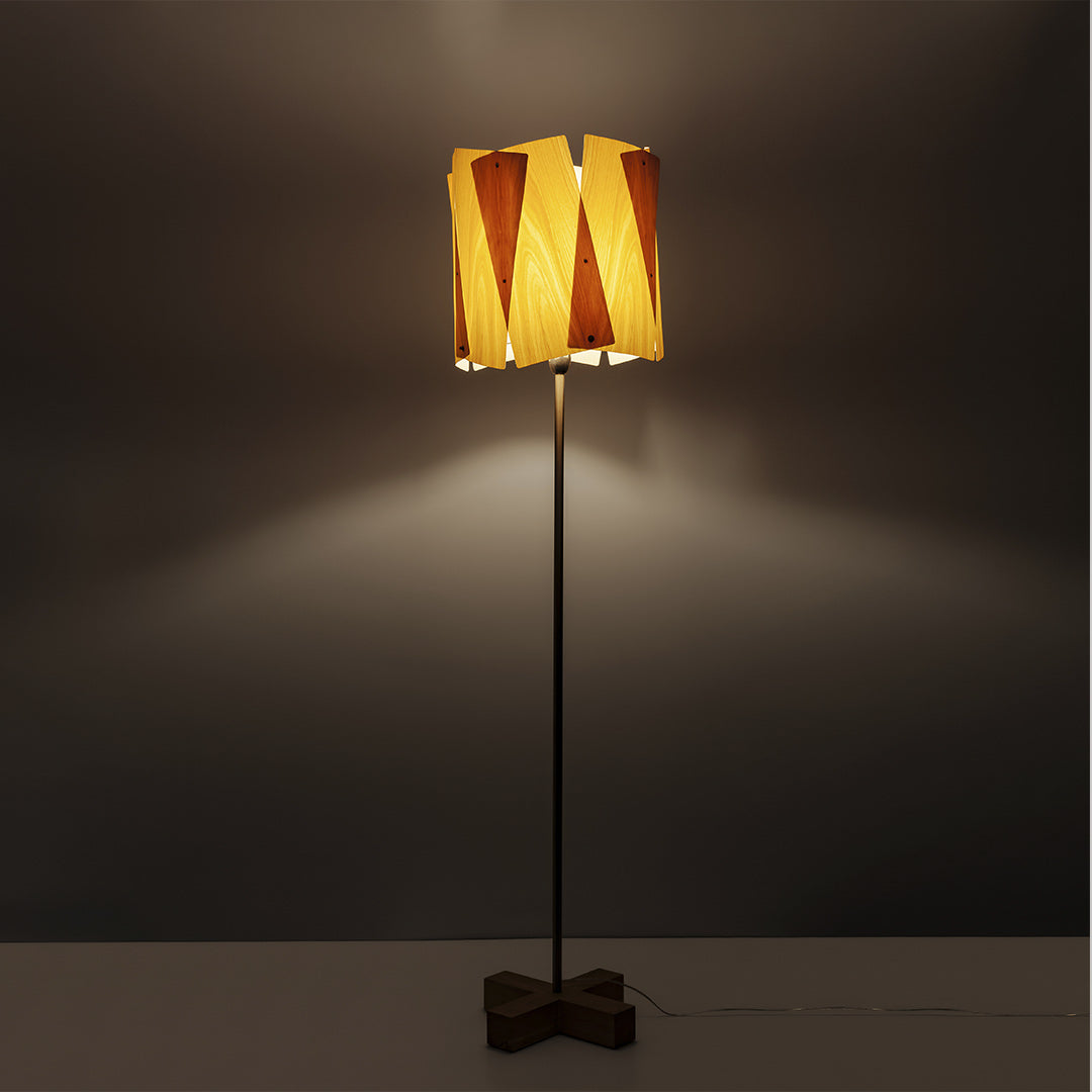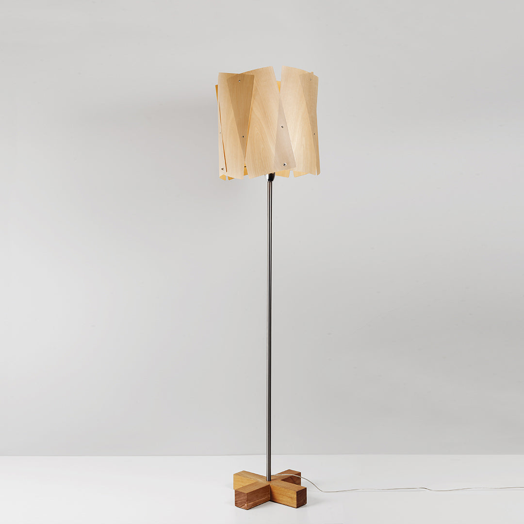 Transforming the original Baum Concept, Baum Fub presents a new standing fixture featuring a wood veneer lampshade and stainless steel rod. The base boasts a unique cross-shaped design, crafted from polished wood, lending a rustic and sturdy aesthetic.