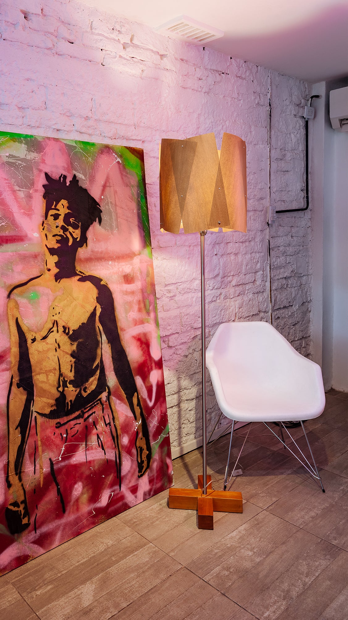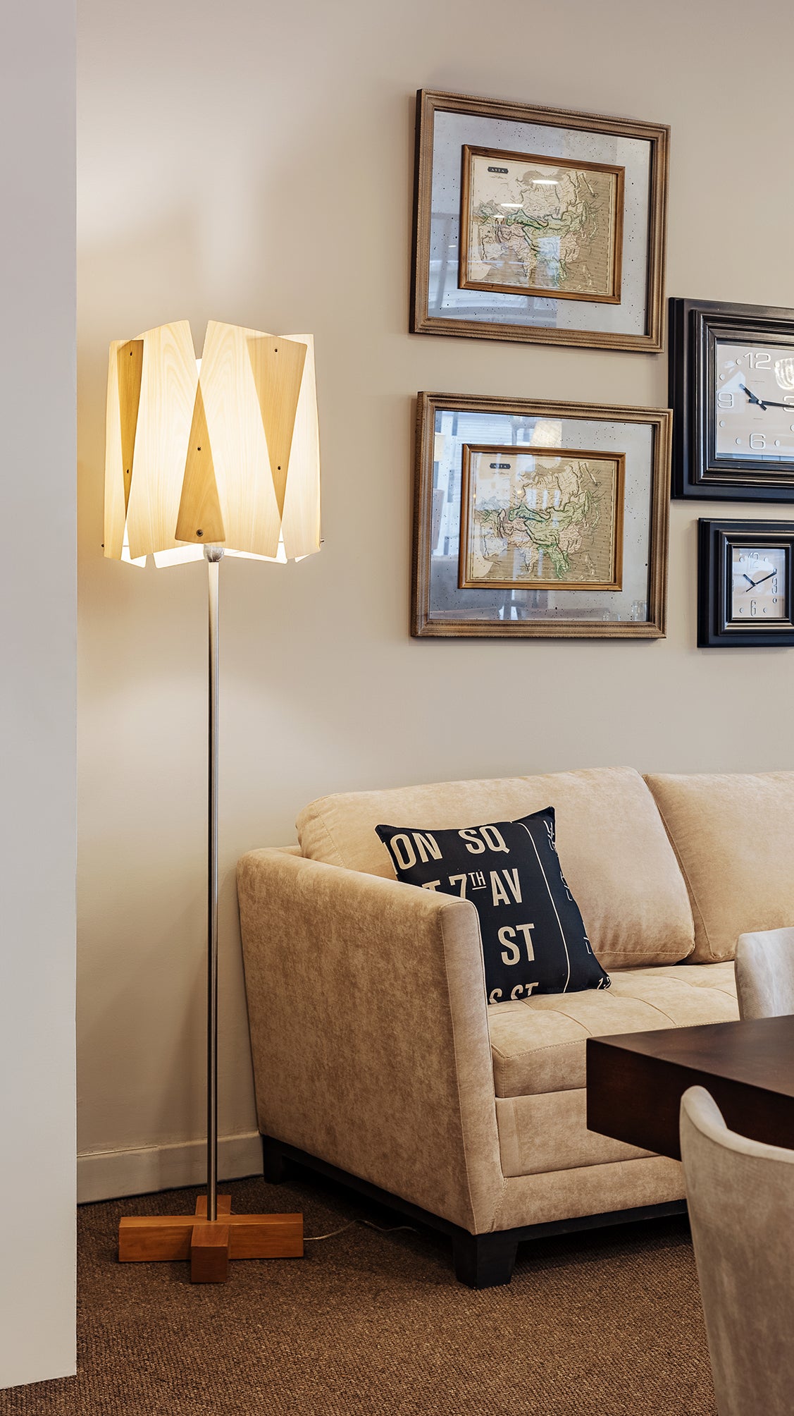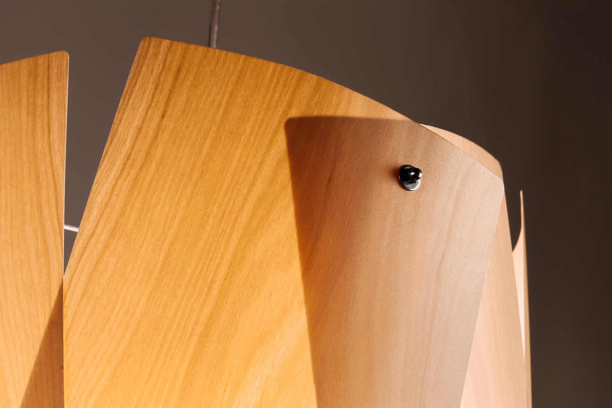 Transforming the original Baum Concept, Baum Fub presents a new standing fixture featuring a wood veneer lampshade and stainless steel rod. The base boasts a unique cross-shaped design, crafted from polished wood, lending a rustic and sturdy aesthetic.