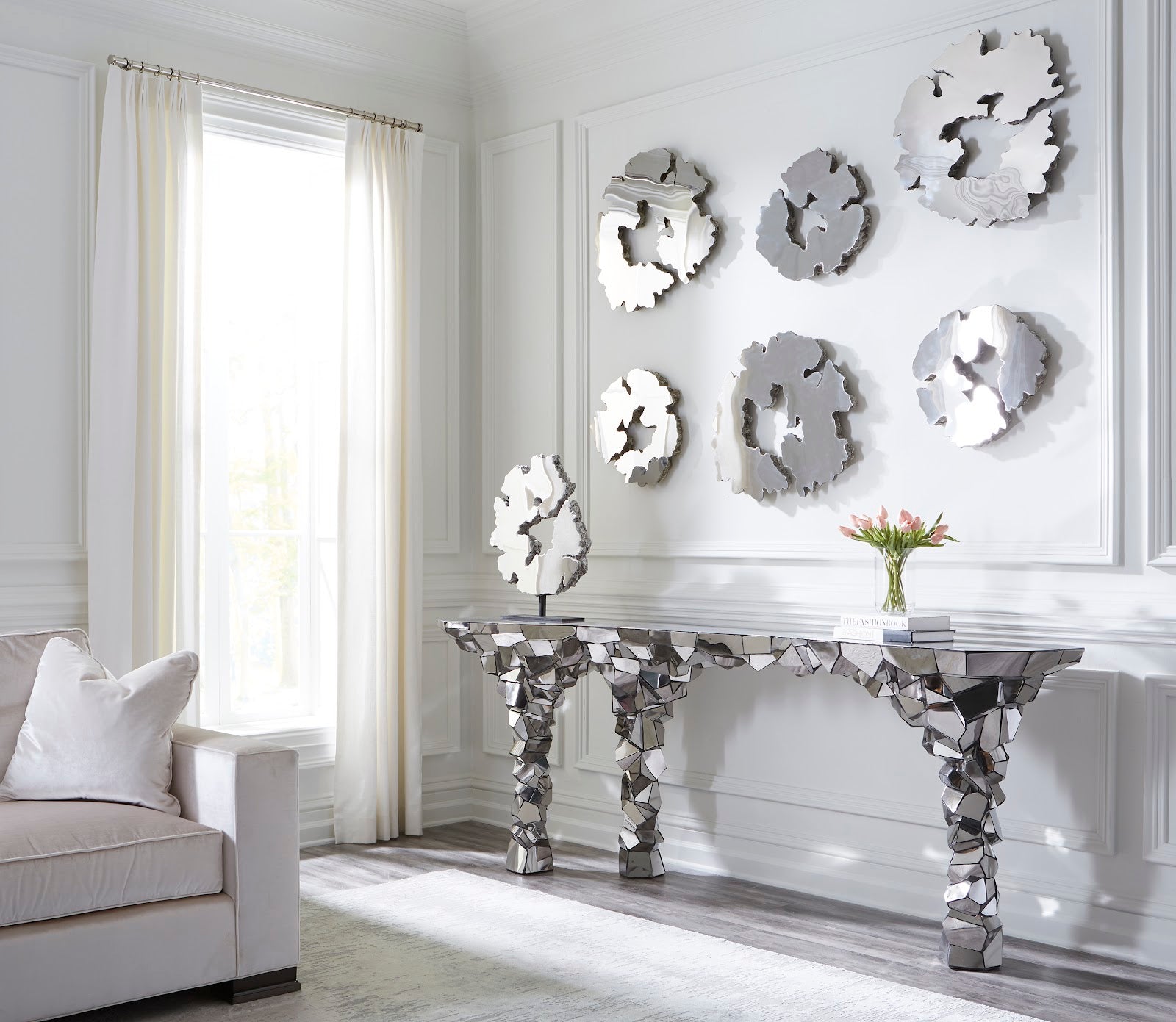 Crafted with expertise and precision, the Crazy Cut Console Table embodies elegance in combining natural curves with modern elements. Made from resin and expertly adorned with stainless steel cuts, this generously sized piece emulates a striking rock formation. It will effortlessly command attention in any space and introduce a contemporary asymmetry that will inspire your decor. The Crazy Cut Collection offers a variety of statement pieces that epitomize the Phillips Collection's ethos of modern organic design.