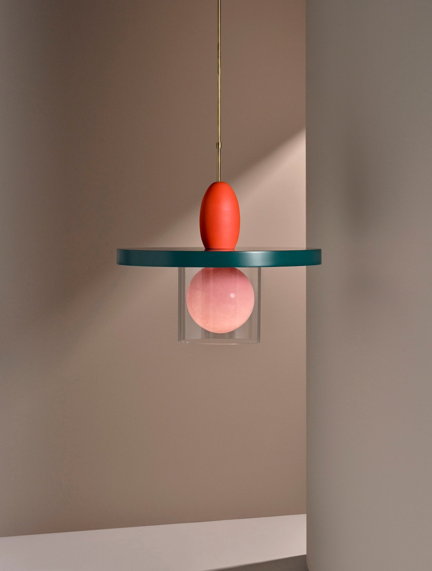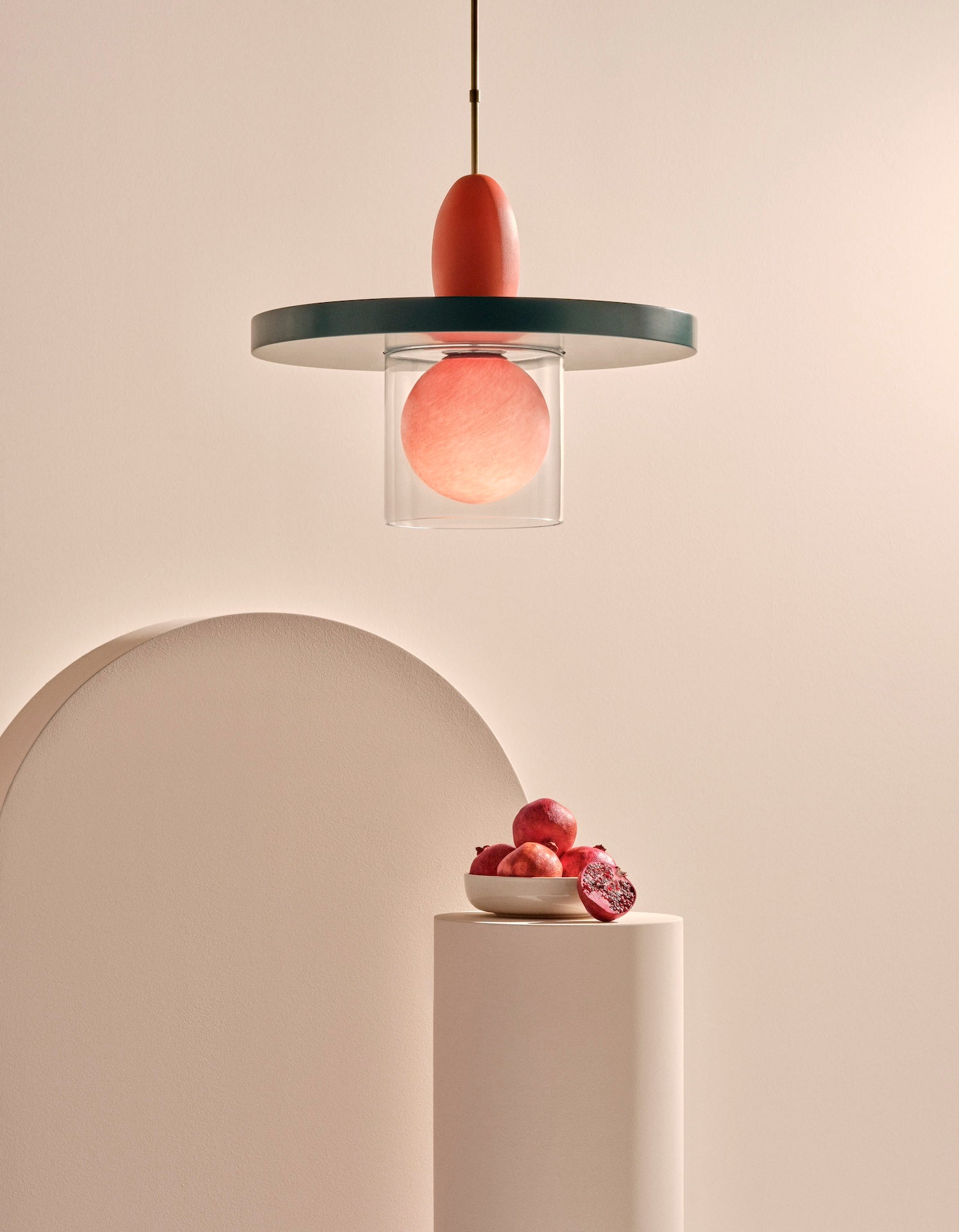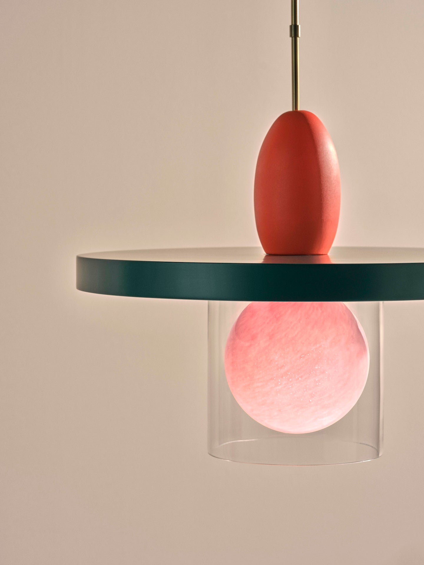 The pendant light Eirene consists of a cylindrical transparent glass, behind which a pink-pigmented glass sphere encloses the light body. Above it is a petrol-coloured lacquered wood and an orange-painted ceramic part. A suspension tube made of sturdy iron, coloured in gold-silver, holds the lamp stable and securely, with the length of the suspension being adjustable.