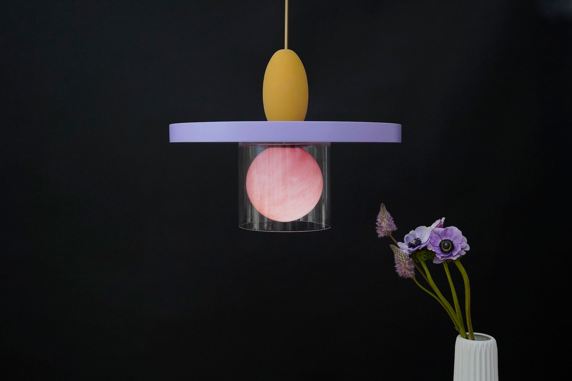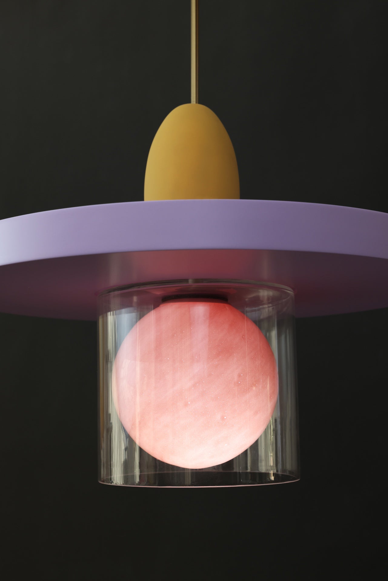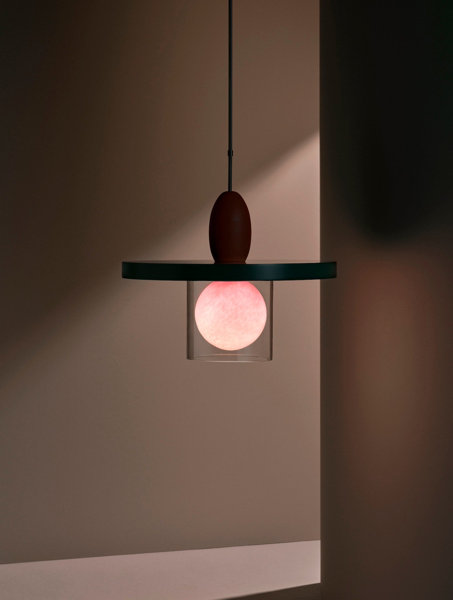 The pendant light Eirene consists of a cylindrical transparent glass, behind which a pink-pigmented glass sphere encloses the light body. Above it is a petrol-coloured lacquered wood and an orange-painted ceramic part. A suspension tube made of sturdy iron, coloured in gold-silver, holds the lamp stable and securely, with the length of the suspension being adjustable.