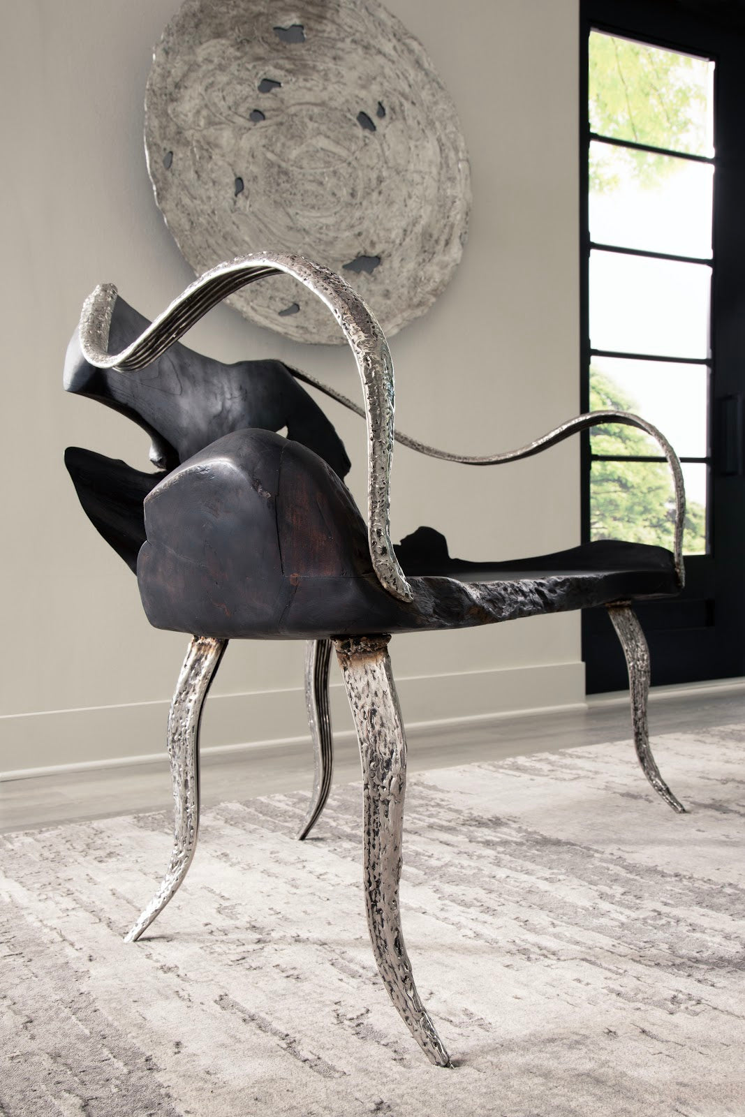 The Graven Live Edge Chair offers a fresh take on organic modern style. Crafted from reclaimed teak wood and hand-finished in a soft black tone, it features uniquely sculpted stainless steel legs. Each chair is distinct, showcasing the natural variations of the wood. Arrange a pair in your room to evoke the feeling of sitting upon an ancient throne.
