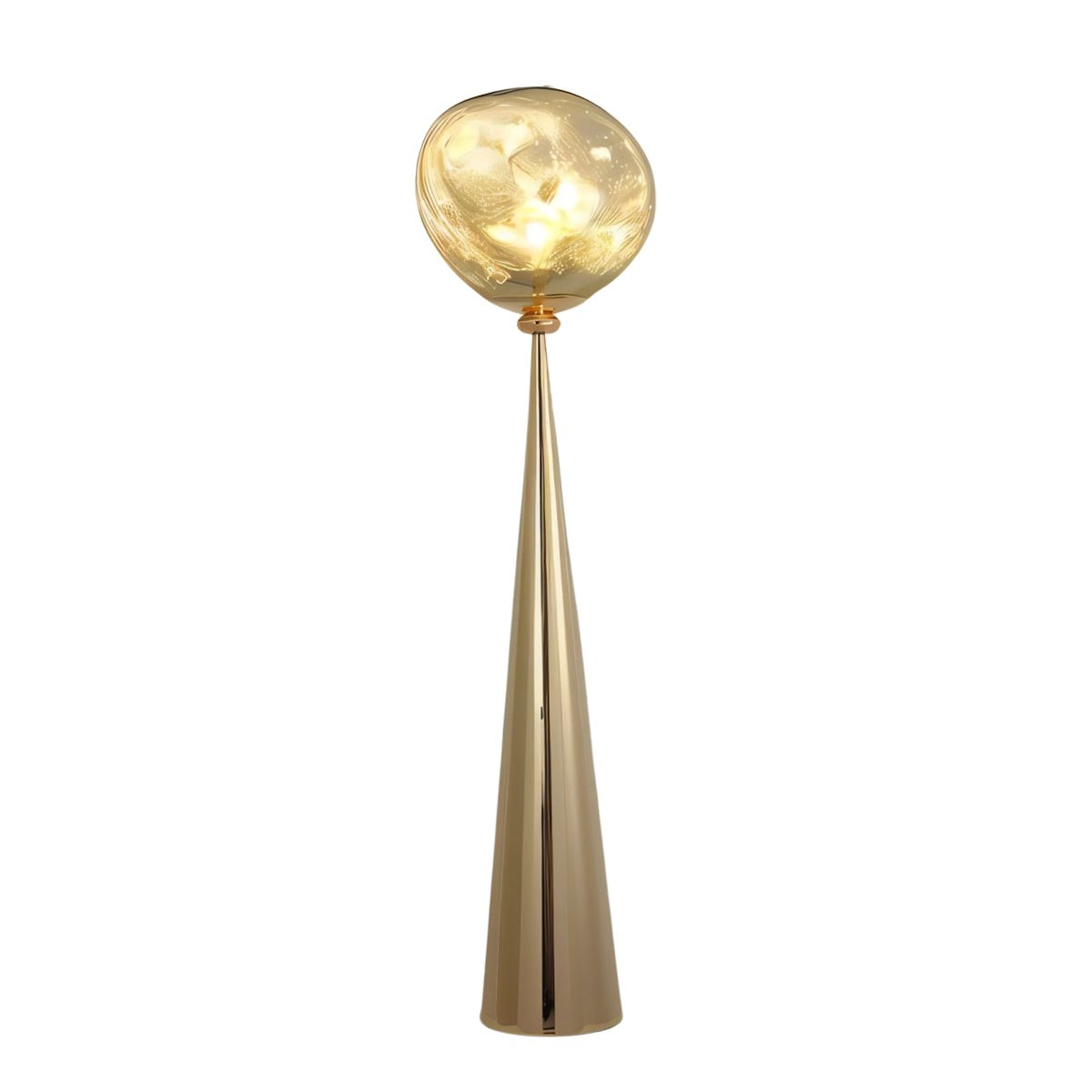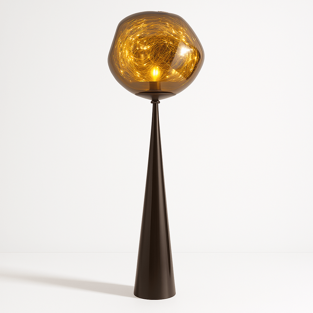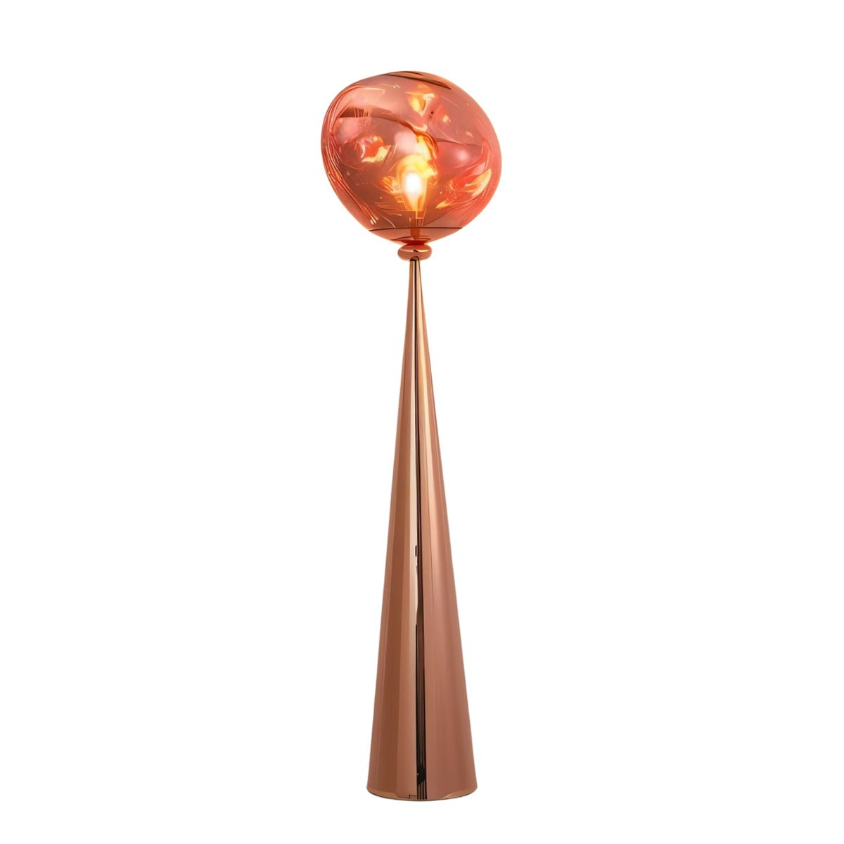 The Lava Floor Lamp features a beautifully distorted glass lampshade and a conical stainless steel body, blending art and functionality. When on, it creates an ethereal hot-blown glass effect; when off, it offers a sleek mirror finish. Available in metallic hues, it adds drama and luminosity to any space. Perfect for a living room or hallway, it pairs beautifully with an armchair for ultimate tranquility. This statement lamp elevates any corner with its contemporary design and captivating glow.