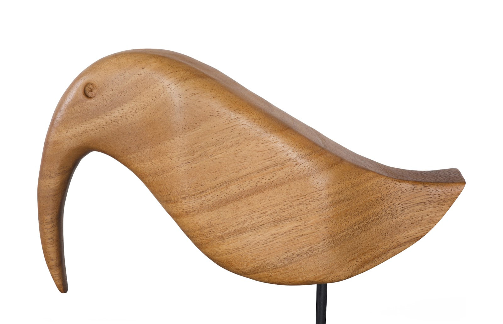 Embracing whimsy with refined artistry, the Natural Bird Sculpture captures a sharp, lively presence. Its clean silhouette and delicate wire legs contrast strikingly with the intricate woodgrain patterns, creating a sophisticated textural accent. Compact enough for a bookshelf, this sculpture also shines as part of a curated grouping atop coffee table books, adding visual interest. Available in both natural and charred finishes, it offers a dynamic interplay of light and dark tones for versatile styling.