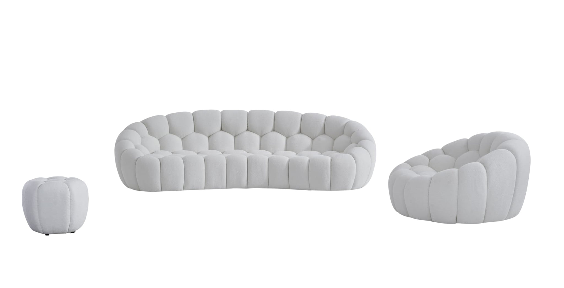 The Nest Curve Sofa, featuring a white boucle upholstery, embodies a seamless blend of emotion, practicality, and modern design. Its unique form establishes the Nest Sofa as a signature element within our collection.