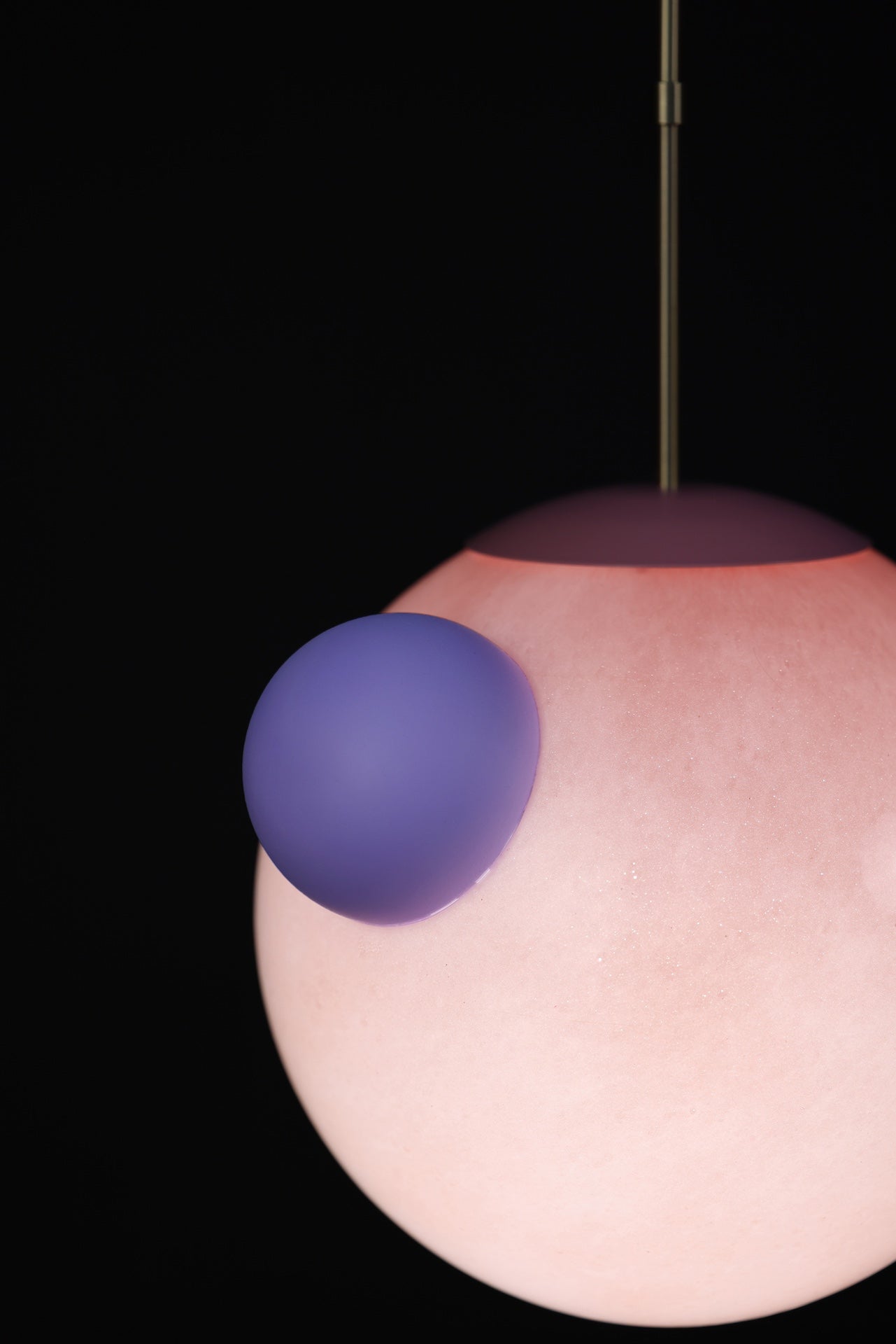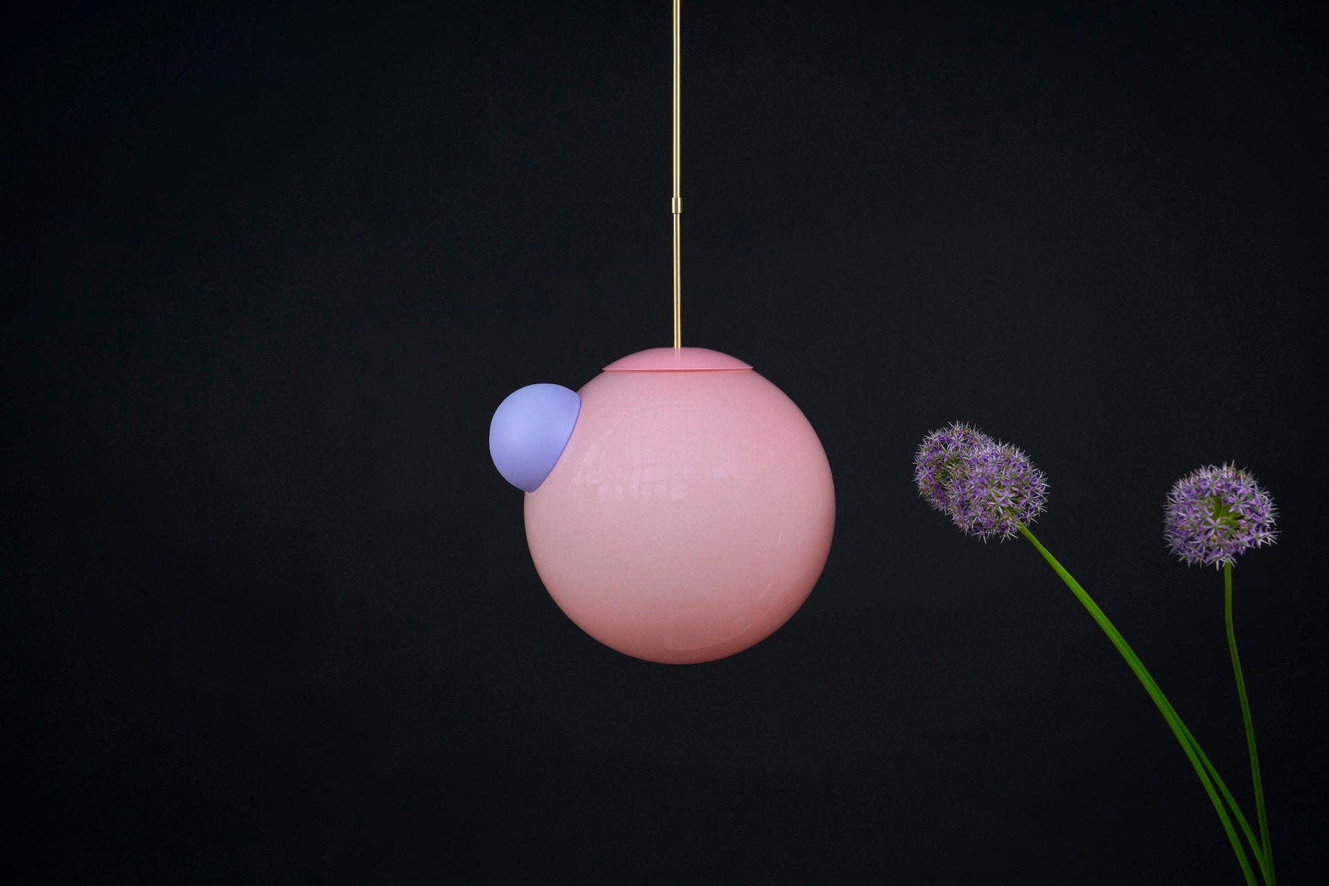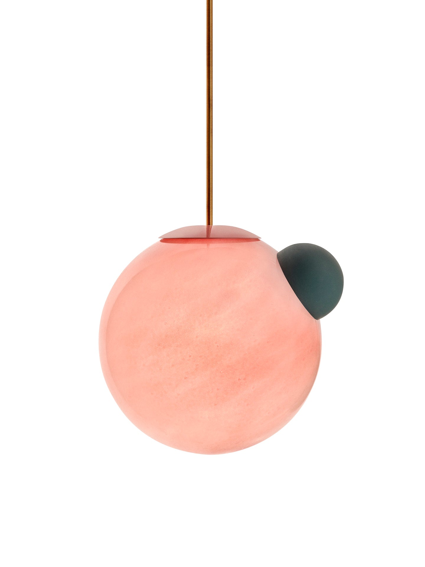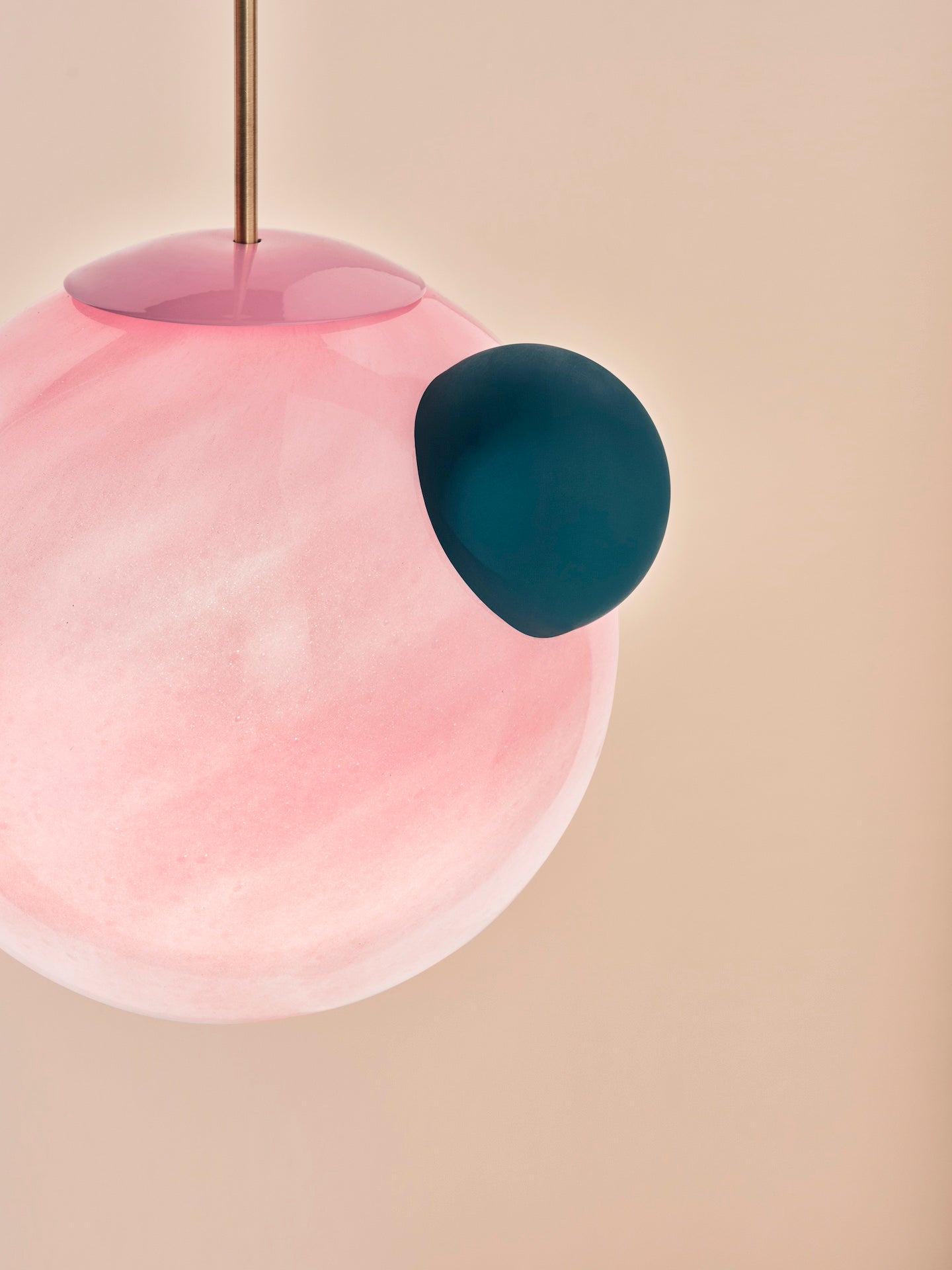 The pendant light Ourania consists of a pink-pigmented glass sphere that carries a petrol-coloured ceramic sphere on one side. A suspension tube made of sturdy iron, coloured in gold-silver, keeps the lamp stable and secure, with the length of the suspension being adjustable.
