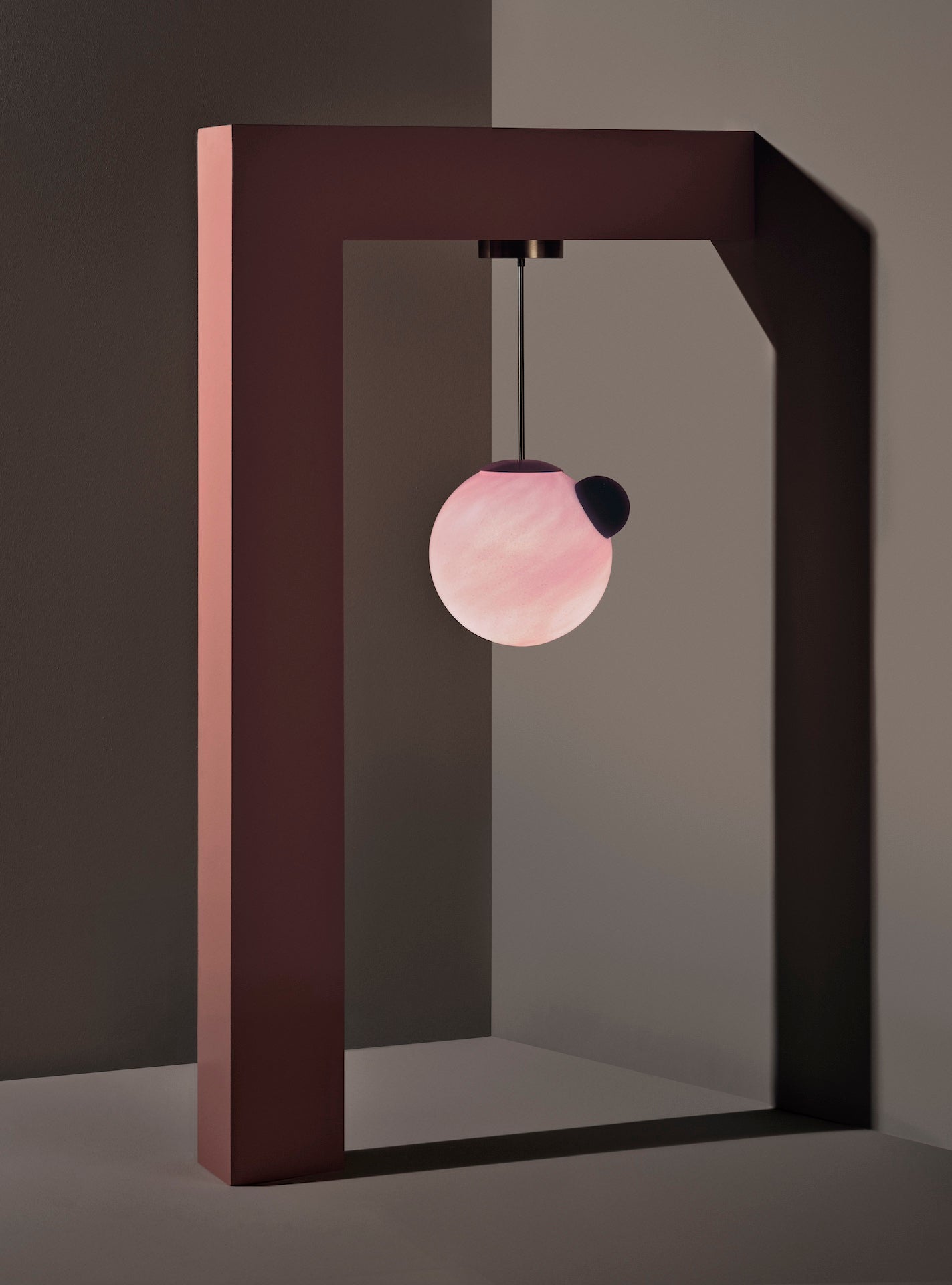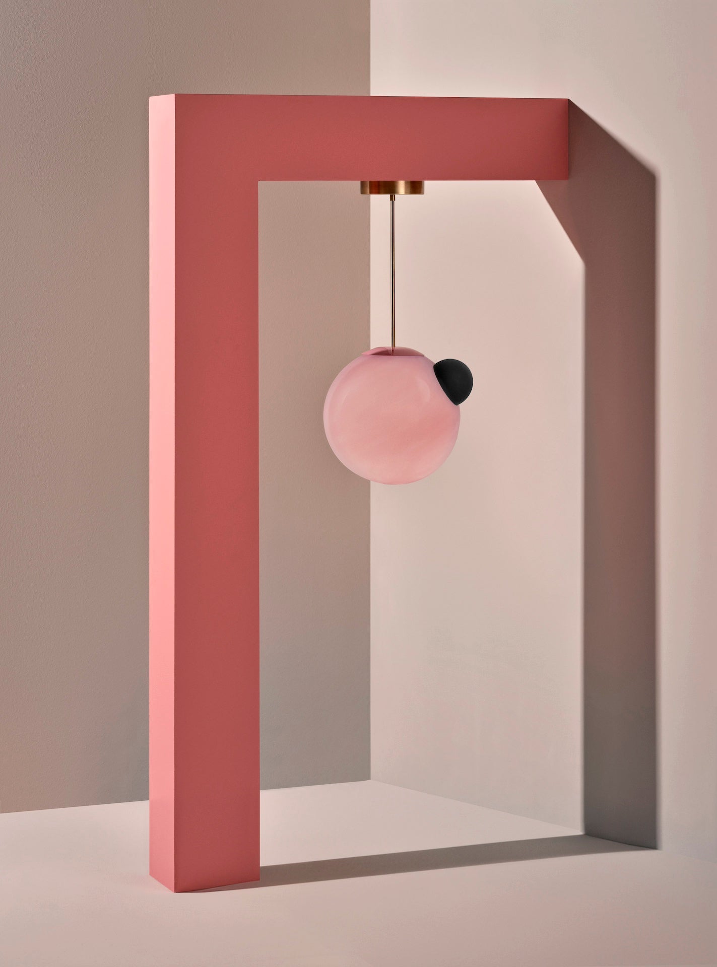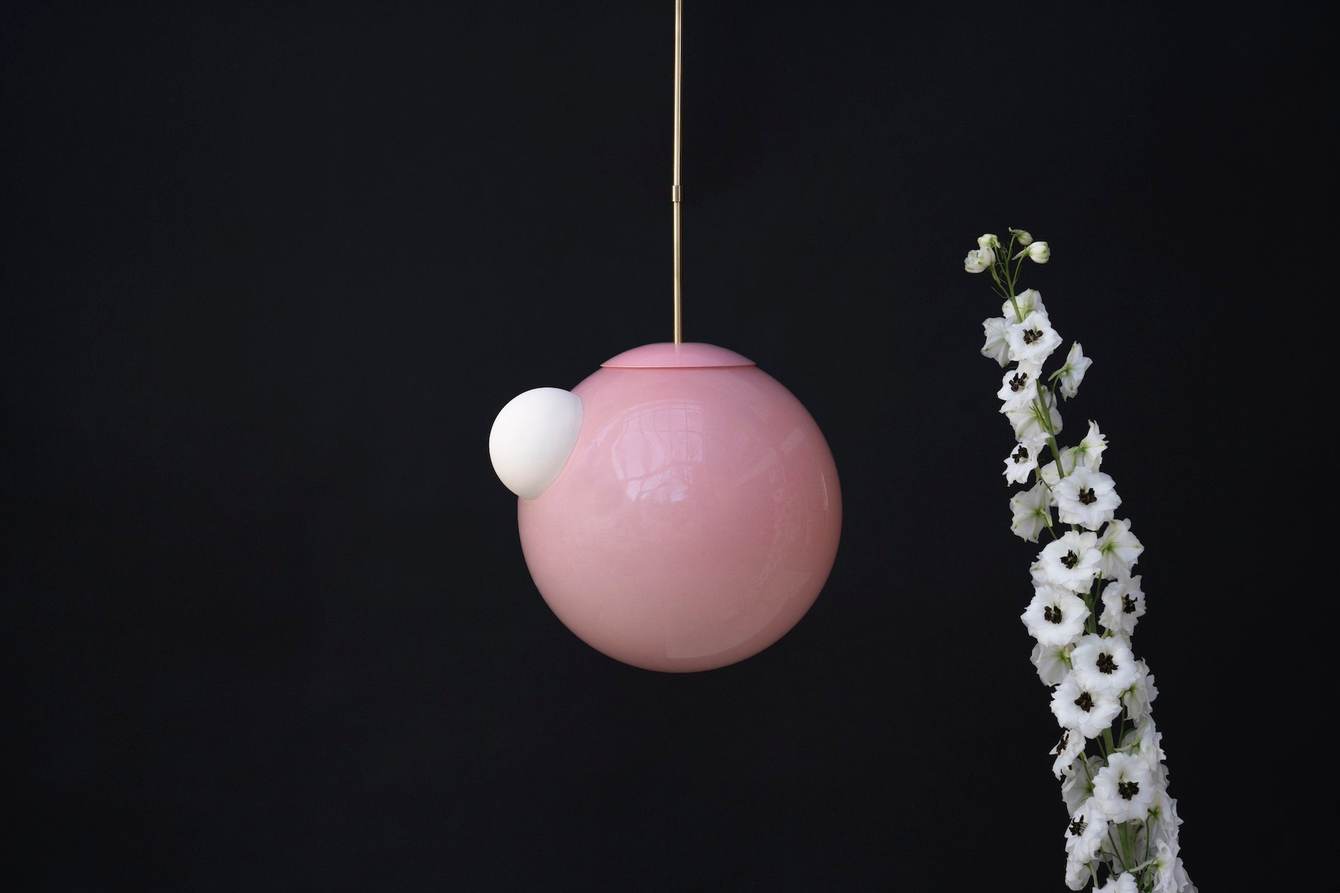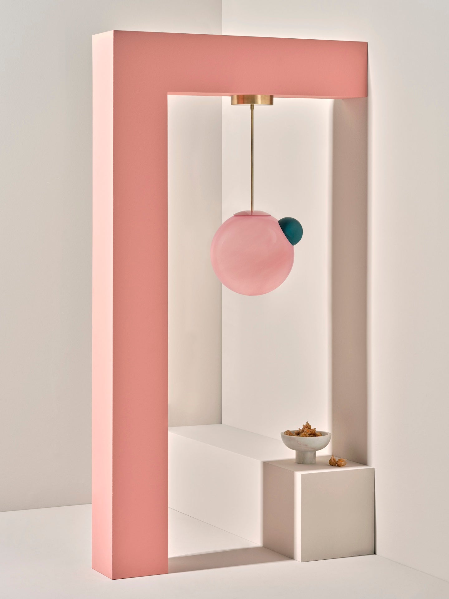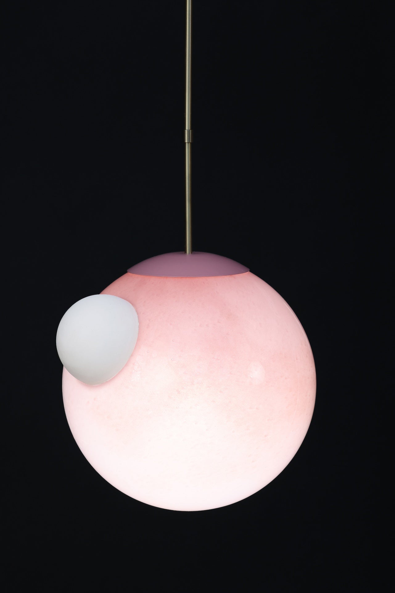 The pendant light Ourania consists of a pink-pigmented glass sphere that carries a petrol-coloured ceramic sphere on one side. A suspension tube made of sturdy iron, coloured in gold-silver, keeps the lamp stable and secure, with the length of the suspension being adjustable.
