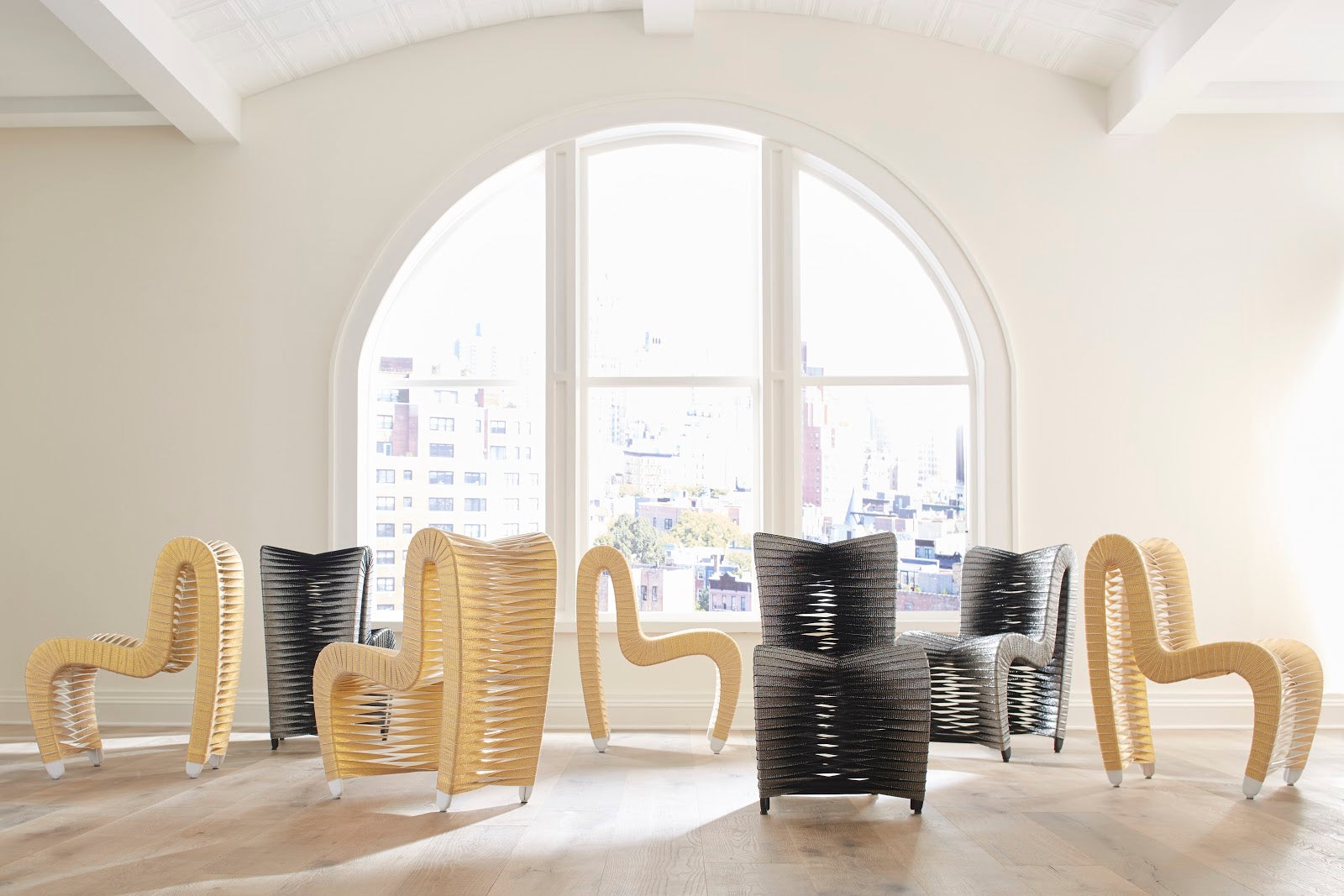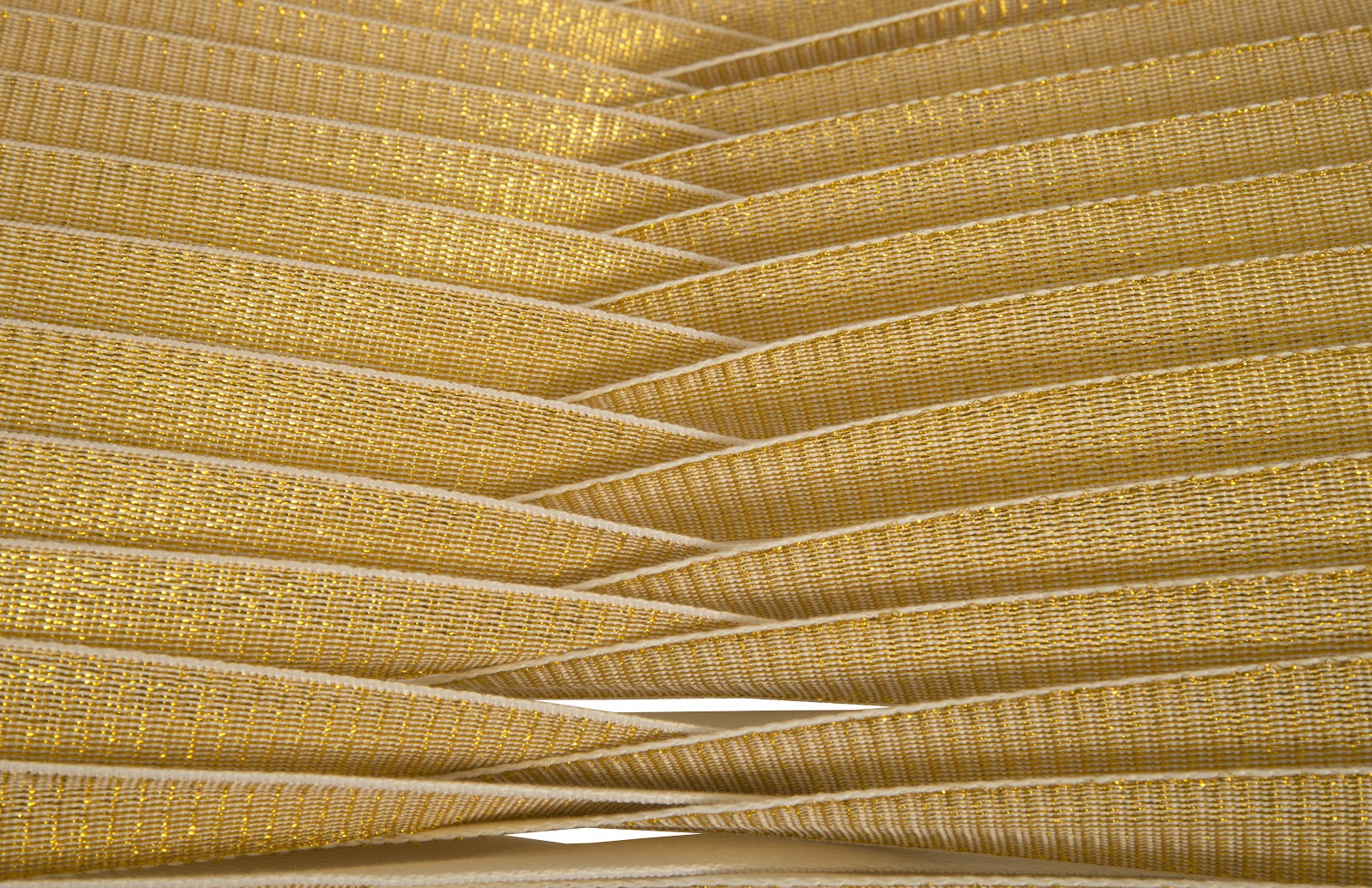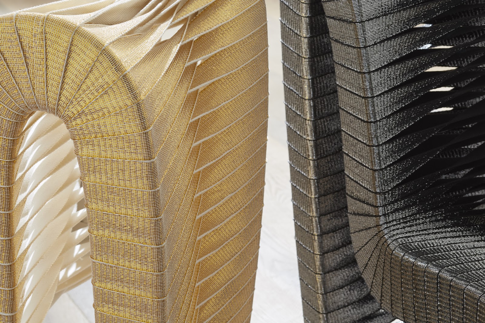 The Seat Belt Dining Chair, Gold, Metallic was created by award-winning Thai designer Nuttapong Charoenkitivarakorn as a part of a contemporary seating collection. The inspiration for the design came from observing the interlacing spools of fabric at a seat belt factory. The unique chairs feature a braided back and a stiletto profile, with woven straps on a wooden frame reinforced with metal. There are both monochromatic and two-toned options available in a variety of colors, with the possibility of custom color matching for orders of 16 or more. These chairs embody the modern organic ethos of the Phillips Collection.