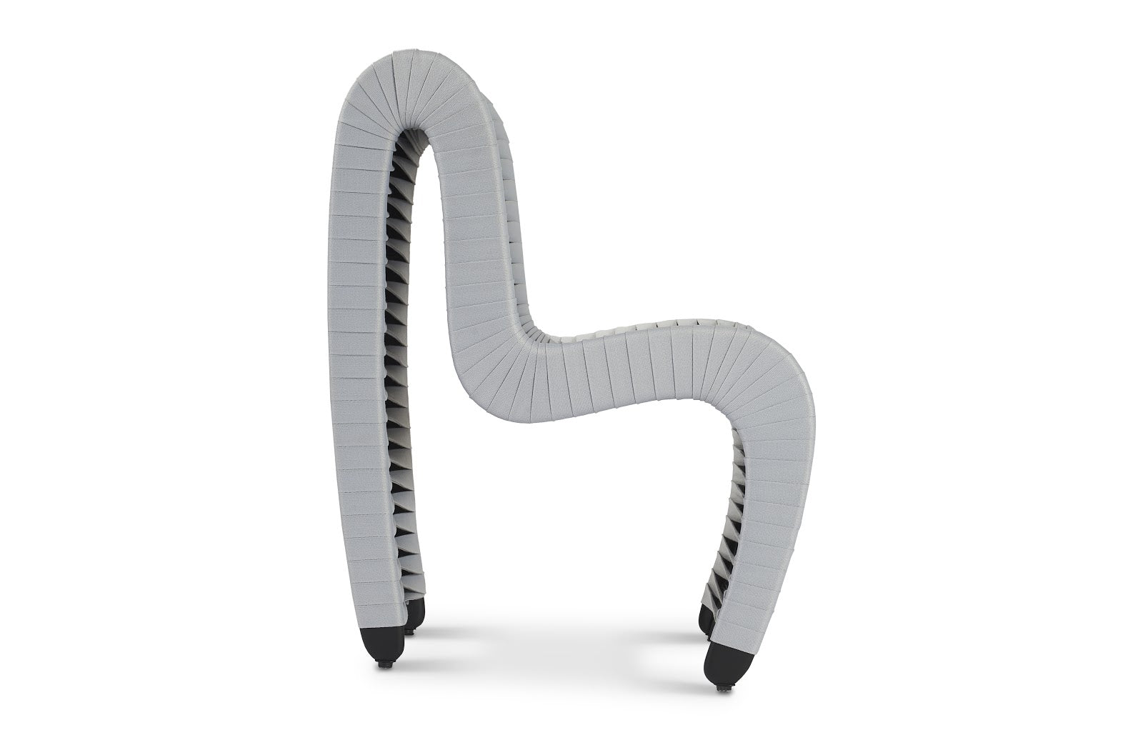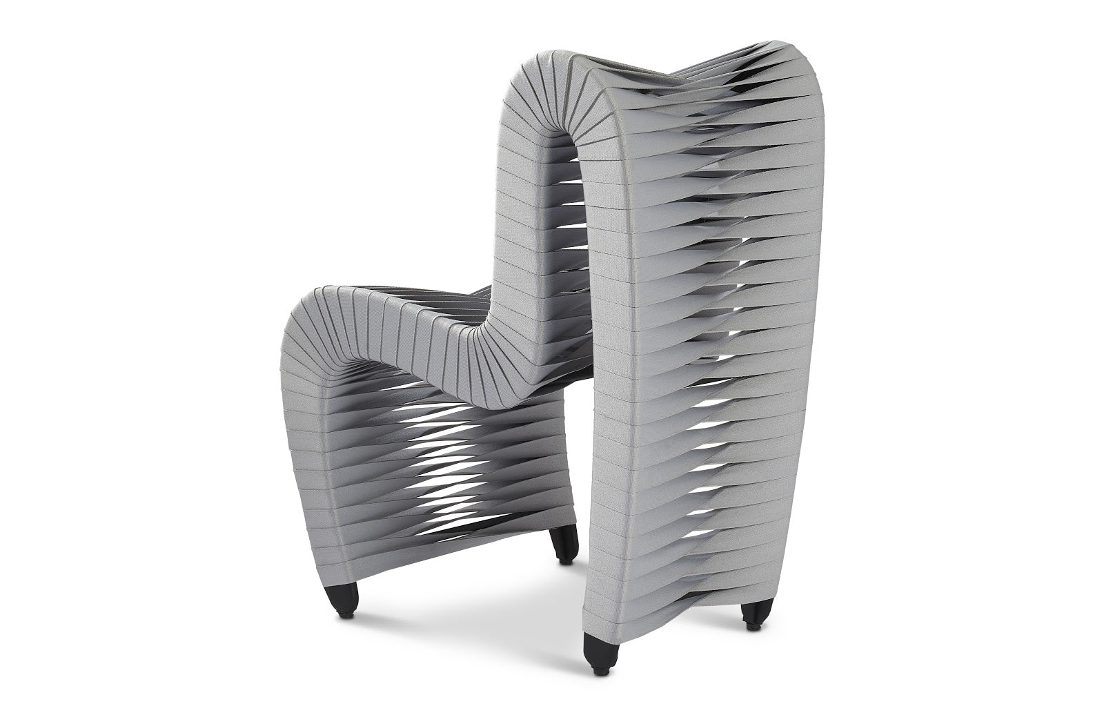 The Gray/Gray seat belt dining chair is a part of our contemporary seating collection designed by Nuttapong Charoenkitivarakorn, an award-winning Thai designer. Inspired by the interlaced spools of fabric seen in a seat belt factory, the design features a unique braided back and stiletto profile. The chair frame is made of wood and reinforced with metal, with straps woven onto it. Both monochromatic and two-toned versions are available in a variety of colors, with the option for custom color matching for orders of 16 or more. This design embodies the modern organic ethos that the Phillips Collection is known for.