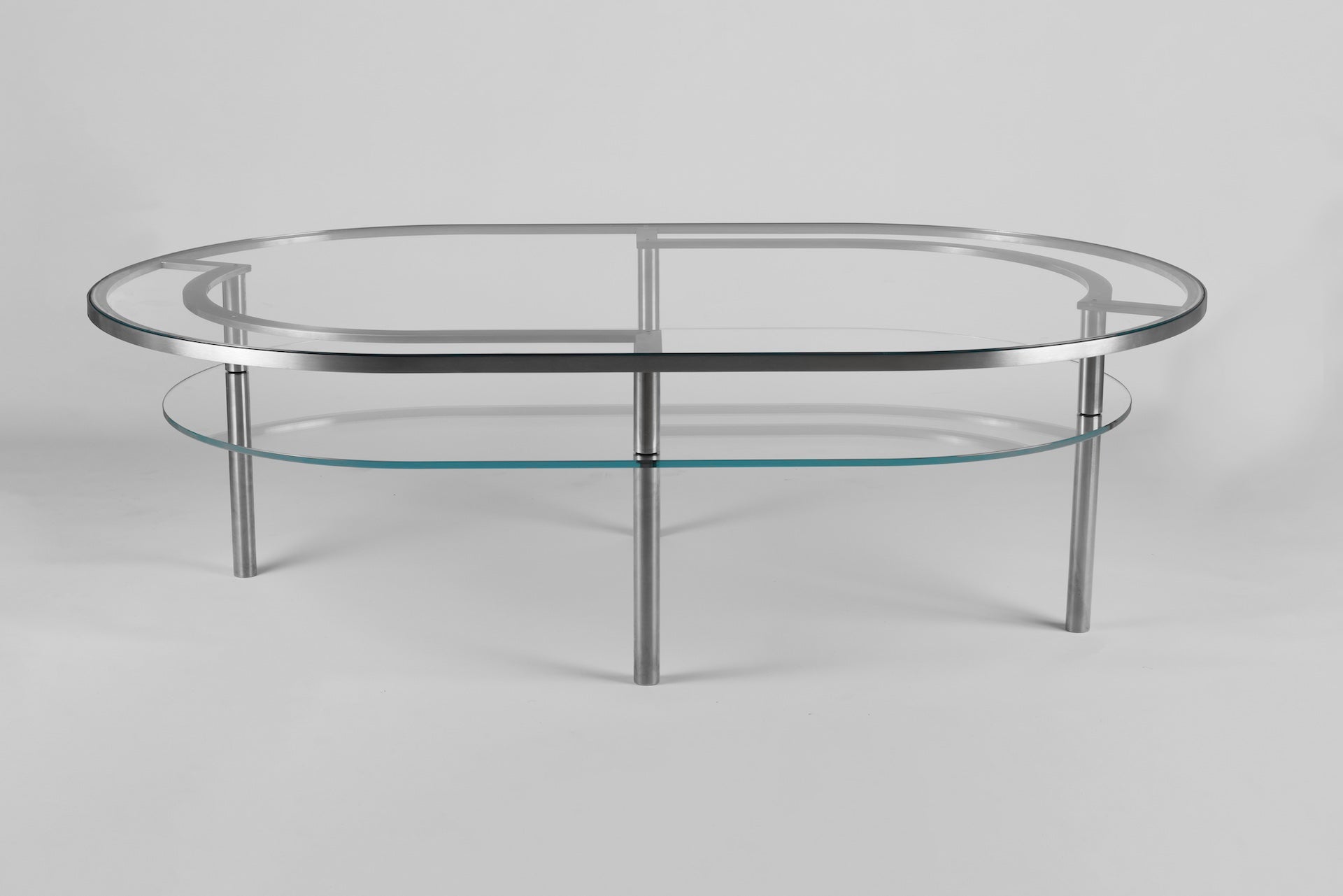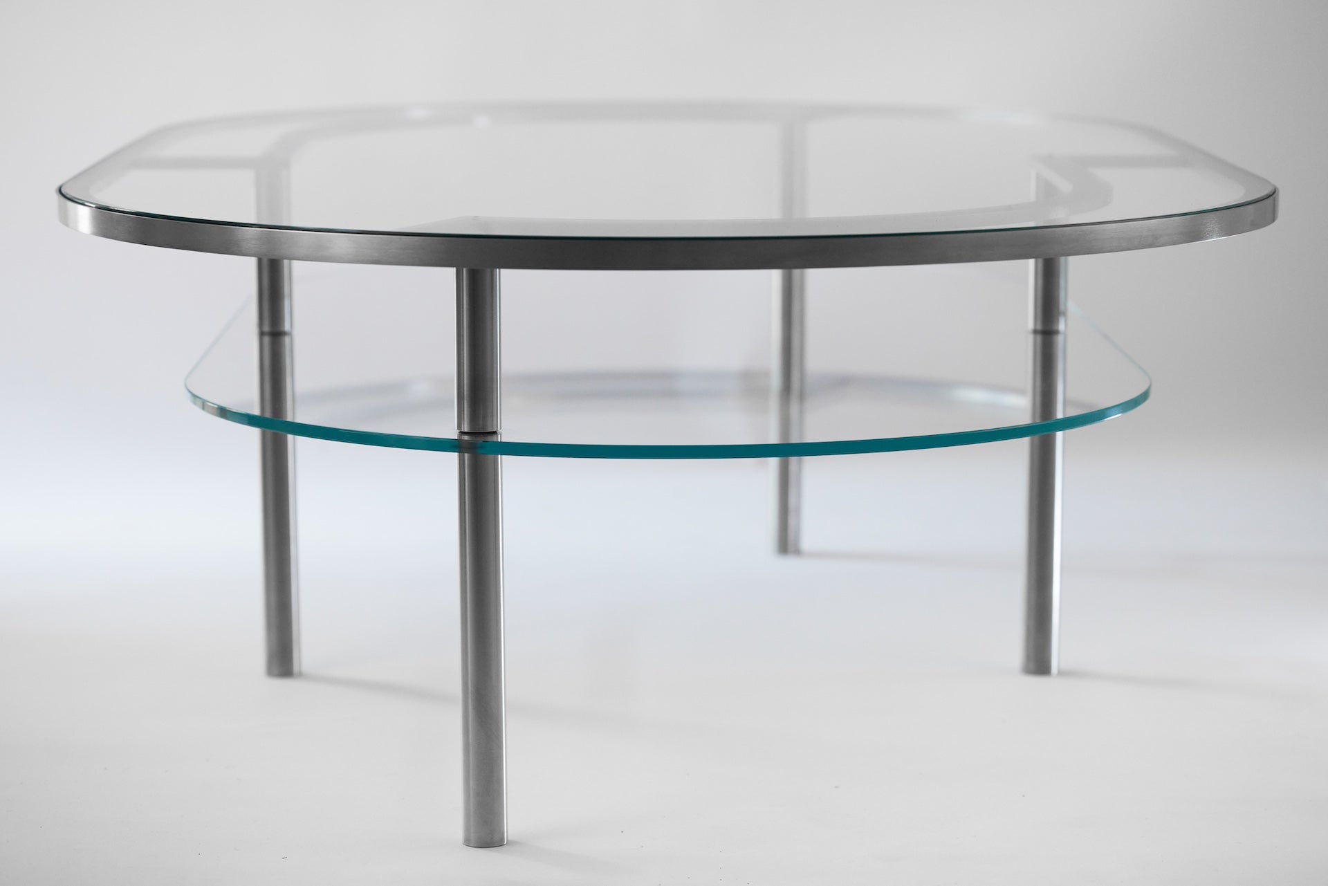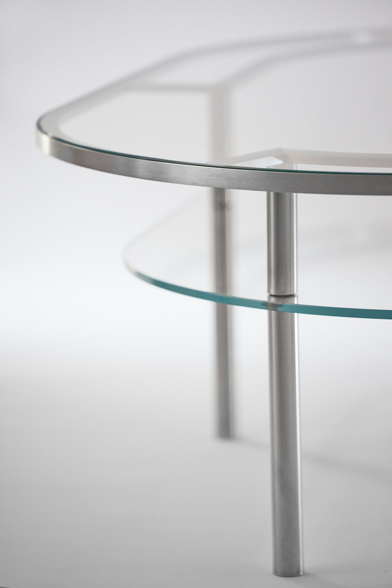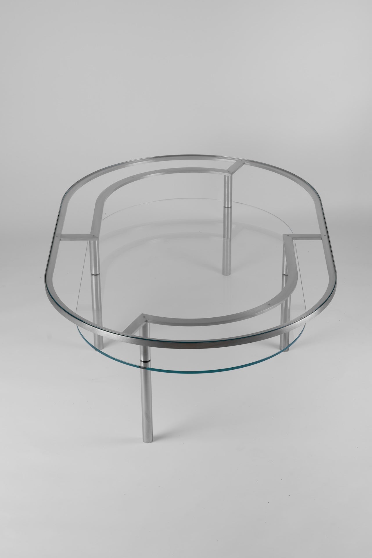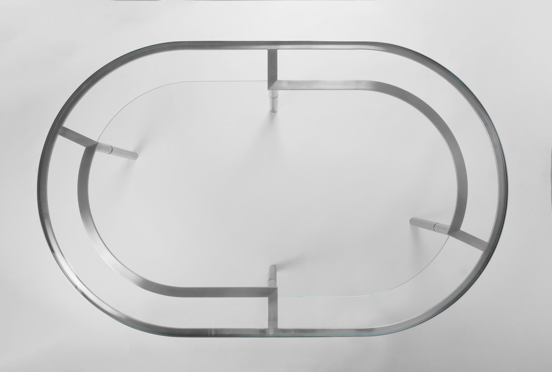 The table’s stainless steel structure and double-layered glass surfaces emphasize this dynamic. From above, the identical shapes of the metal structure mirror each other in an offset configuration, symbolizing the balance and movement of opposing ideas.